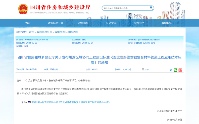 該標(biāo)準(zhǔn)主要適用于川渝區(qū)域市政、水利、交通等工程項(xiàng)目中玄武巖纖維增強(qiáng)復(fù)合材料管道及管件的試驗(yàn)、設(shè)計(jì)、施工、質(zhì)量驗(yàn)收與評(píng)定,有效填補(bǔ)玄纖產(chǎn)品標(biāo)準(zhǔn)體系在行業(yè)內(nèi)的空白。目前,該標(biāo)準(zhǔn)已順利發(fā)布,并將于2024年10月1日正式實(shí)施。