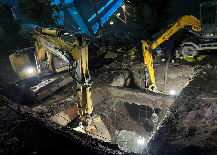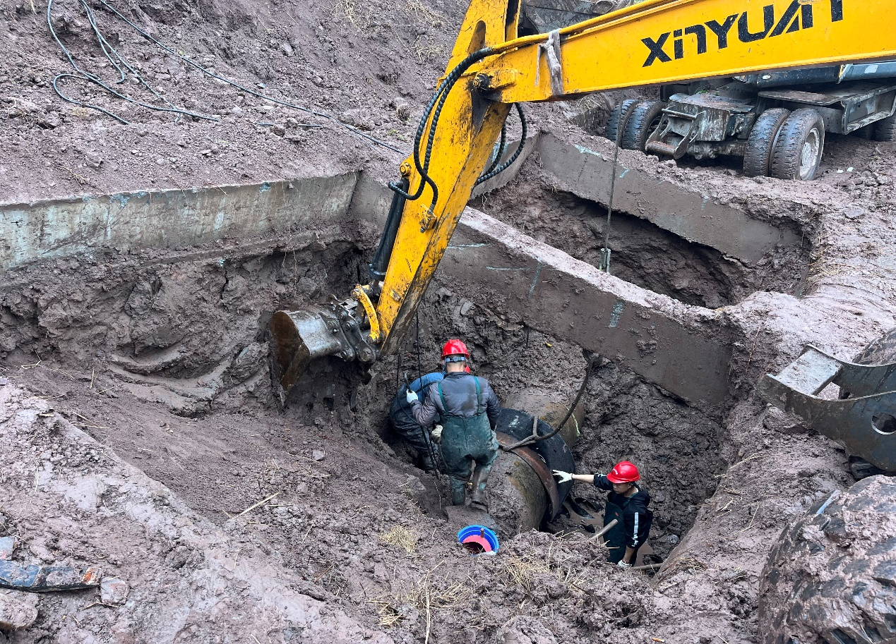 險情發(fā)生后,水務(wù)集團(tuán)黨委高度重視,黨委書記、董事長盧輝帶隊奔赴搶險現(xiàn)場指揮調(diào)度,要求惠泉公司立即組織搶修,盡快恢復(fù)管網(wǎng)運(yùn)行,盡最大努力減少污水外溢,集團(tuán)安全環(huán)保部、規(guī)劃建設(shè)部、惠潤達(dá)公司到場指導(dǎo)協(xié)助?;萑绢I(lǐng)導(dǎo)班子立即召開緊急現(xiàn)場會,連夜組織調(diào)度搶險人員和設(shè)備,出動搶險人員100余人次,挖掘機(jī)、吊車、多功能搶險車等工程機(jī)械10余臺,合理調(diào)配人手,組建臨時班組,采取人機(jī)輪班,就地休息的方式,在確保安全的情況下,迅速開展搶險工作。